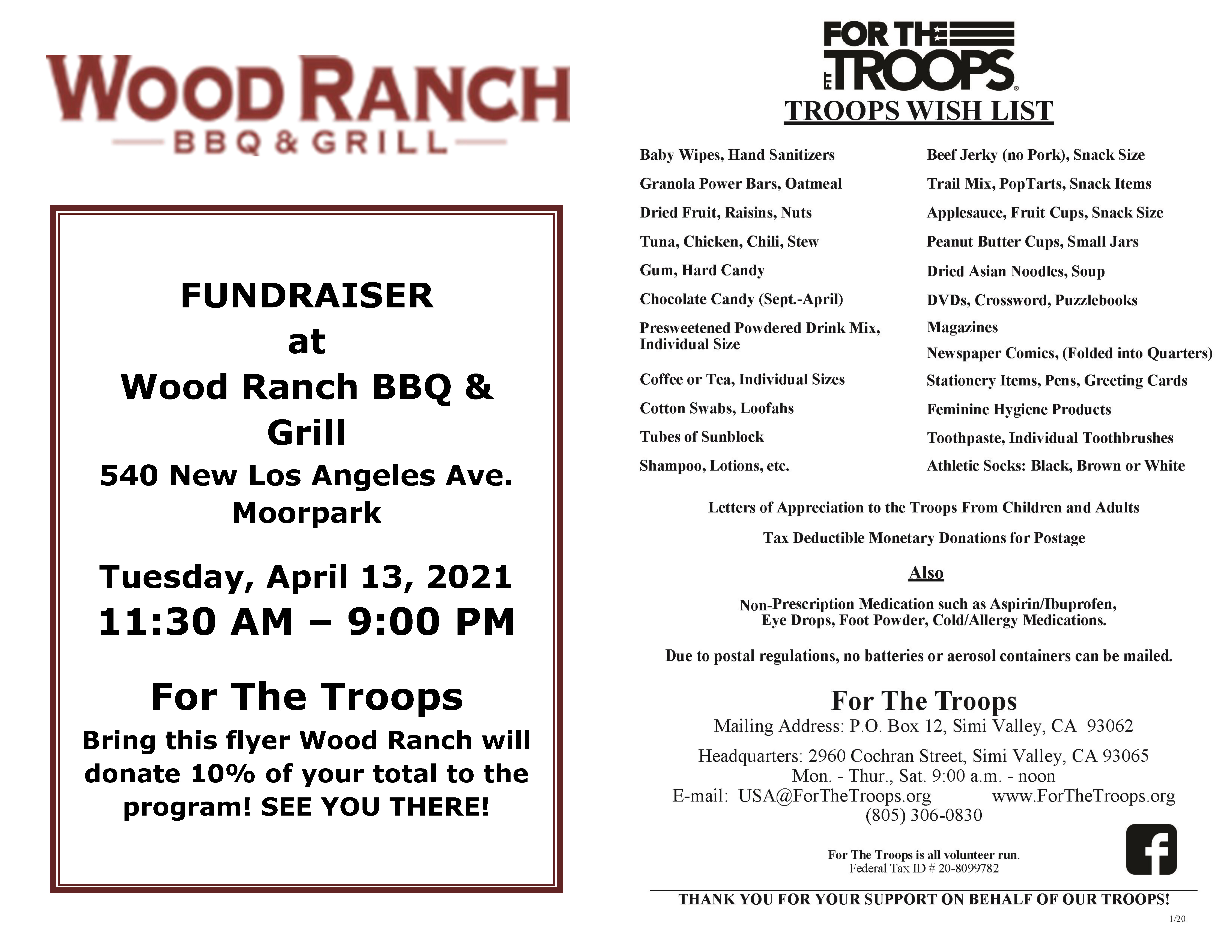 Join Us for our fundraiser at Wood Ranch BBQ& Grill. Located at 540 New Los Angeles Ave, Moorpark, on Tuesday, April 13th from 11:30 am – 9:00 pm. Please click here to view and print the flyer.